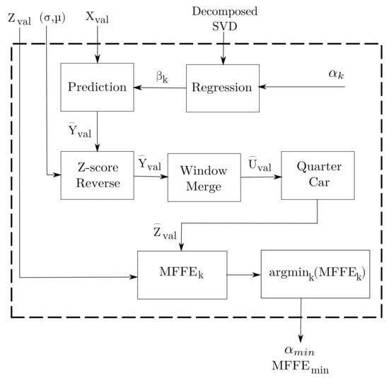 Figure 6 depicts a graphical overview of the regularisation constant optimisation. The regression coefficients are then calculated and weighted with , where k is the iteration of the loop. The approximated windowed validation inputs are then predicted using the windowed validation outputs . The approximated windowed validation inputs are rescaled and then merged using the specified windowing methods to obtain the approximated input . The merged inputs are then passed through the test rig to obtain the approximated output . The MFFE is then calculated between the true output and the approximated output . The optimised regularisation constant and the corresponding minimum MFFE are then returned from this loop to the windowing loop as seen in Figure 5. This minimum MFFE result is then used in the window loop to find the corresponding optimal window length .