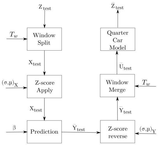 A graphical overview of the prediction step and the approximation of the output is shown in Figure 7. Once the training step is complete, it is relatively straightforward to use the optimised parameters to make further predictions. The test output signal needs to be preprocessed first before predictions can be made. To obtain the predictor matrix, , the test signal is windowed and z-scored normalised using the parameters determined during the training phase. The prediction step then occurs using the regression coefficients obtained during training to obtain the approximate target matrix, . The windowing and z-score normalisation are then reversed before passing the approximated input into the test rig to obtain the approximated output, .