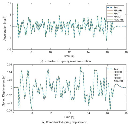 The three different regularised FIR implementations will be compared against ADA combined with RR for two different test cases, linear and nonlinear. The experiment will be performed with a system configuration more representative of a typical test rig. In this case the sprung mass acceleration and spring displacement (i.e., the delta between the sprung and unsprung mass) of the quarter car will be used. The first being the linear system and the second being the default nonlinear system. The inputs and responses will be sampled at 250 and 350 for the linear and nonlinear systems, respectively. The window lengths will be determined via grid search cross validation with the window lengths being sampled from with a grid of 50 equally spaced intervals. The potential values used to regularise RR will be spaced equally on a log scale within the range , where s are the singular values. Thirty equally spaced divisions will be used. An overview of the numerical experiment parameters is given in Table 4.