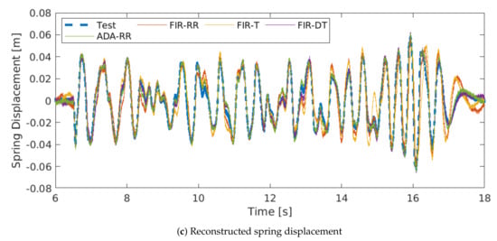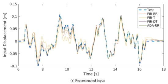 The investigation is not exhaustive but rather proposed to give an illustrative sense of the regression methods’ performance on a challenging response reconstruction problem. To this end, the numerical experiment will be performed with the FIR and ADA regression methods with noise, model-mismatch and nonlinearity implemented. This investigation’s level of noise is defined in percentage terms, , of the standard deviation for each channel o of the outputs z. The noise is assumed to be Gaussian with zero mean, resulting in