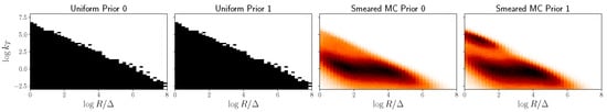 Left (Right) columns: Probability distributions of the uniform (smeared Monte Carlo) prior. We only show the leading jet themes, with the subleading jets exhibiting a similar behavior.