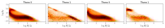 LDA was first proposed as a topic model for texts with other topic models have been previously used for collider studies in [] for quark/gluon jet discrimination []. The model has two (multidimensional) model-building hyperparameters controlling the shapes of the Dirichlet distributions: the T-dimensional vector for the theme mixing proportions and a matrix where the M-dimensional row controls the shape of the Dirichlet for the theme multinomials over . The number of themes T must also be fixed before training LDA with data. The simplest possible case is a two-theme LDA model with . In this case, the Dirichlet prior reduces to a beta distribution over the unit interval, and reduces to a binomial distribution over . The generative process for a single collider event reads: