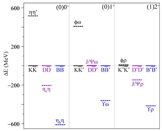 Experimental masses [] of the different color singlets that make up multiquarks with , c, or b, for different sets of quantum numbers, . We display several cases containing pseudoscalar–pseudoscalar, pseudoscalar–vector and vector–vector meson–antimeson components. The reference energy has been set to the corresponding , or mass for the hidden strange, charm and bottom sectors, respectively.