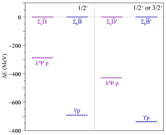 The above equations are written in non-orthogonal bases in color space, made of internal color singlets. They can be transformed to orthogonal bases, see Refs. [,] for details. Such a transformation is suited to dealing with the Pauli principle or for the evaluation of specific matrix elements. Each of the two components in Equation (1) and (2) can indeed evolve into the other one. One is dealing with a compact object whose internal color quantum numbers are not separately conserved during time evolution. In other words, these states are not generally simple bound states of two hadrons. Therefore, their properties can be addressed by means of a coupled-channel calculation involving the two different components of Equations (1) and (2). Beforehand, there is no dynamical reason that could justify the relevance of any of them relying on the overall principles of QCD. At this point, it is relevant to analyze the mass of the different color singlet components to illustrate how the coupled-channel dynamics would be affected depending on the flavor sector one is working with.