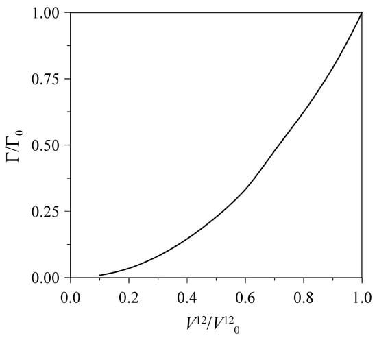 As has already been mentioned above, there is a noteworthy aspect of multiquark resonances. Whereas the dynamics seems to be dominated by the attraction in an upper channel where the resonance appears as a bound state, the tool for detection, however, is a lower channel where the strength of the interaction is rather weak if not negligible. In the case of pentaquarks, for instance, there is no known S-wave binding mechanism for charmonium–nucleon, , combinations [,] (the existence of an attractive potential in the lower channel might lead to bound states that would become deep in energy and therefore extremely narrow, due to the coupling to the upper channel. Neither the width nor the kinematical region would correspond to the experimental situation discussed in Section 2.1). Besides, the measured decay width of the resonances does not follow a behavior, typical for an elastic resonance where q is the available momentum for the decay. Due to the necessary rearrangement of quarks inside the color singlets corresponding to arbitrary normalized values of and in Equations (1) and (2), the coupling potential is short-ranged and weak. Then, our first quest is the evolution of the width of a coupled-channel resonance with a fixed position with respect to the formation and detection channels (channels 2 and 1) in terms of the strength of the coupling between them. For this purpose, we start from the initial conditions drawn at the beginning of this section for a given strength of the transition potential, . We begin to lessen the strength of the transition potential but keep the resonance position fixed by either increasing the attraction in the upper channel or the repulsion in the lower one, obtaining a similar qualitative outcome. The results are shown in Figure 4.