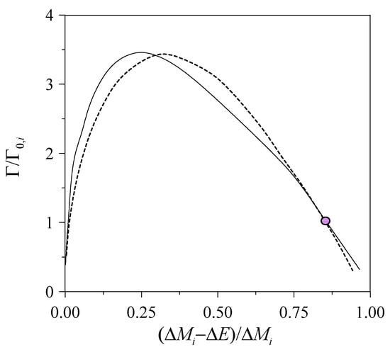 We now wonder if the results obtained in the previous subsection critically depend on the relative distance between the coupled channels. To answer this question, we have generated a second scenario with a different value of . In this case we have reduced the value of by a factor five. We start with the same relative position of the resonance with respect to , corresponding to the purple circle in Figure 6. The results are shown by the dashed line in Figure 6. As can be seen, the behavior of the decay width is rather similar to that obtained in Section 3.2. Although it was to be expected, this result has a rather important consequence, as it is the rapid variation of the decay width of a resonance generated in between coupled-channels that are very close—a small value of . In this case, the decay width of a resonance changes by more than a factor of three in a small interval of around 5 MeV. Thus, for resonances that are generated in between rather close channels, the position of the resonance is crucial for the knowledge of its decay width. For larger values of , the variation of the decay width proceeds more smoothly.