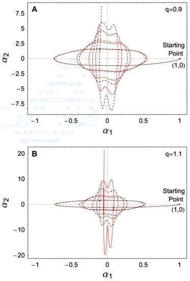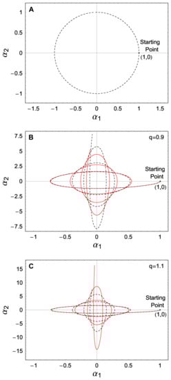 where , , and are real. The parametric plots of and under the choice and the choice of as Equation (16) are given in Figure 1 and Figure 2, respectively. Figure 1A shows that the trajectory of the parametric evolution of and for a non-driven un-damped oscillator is symmetric from the origin. Such a symmetry is destroyed if there is a damping in the system (see Figure 1B,C). Nonextensivity of the system also acts as a source of symmetry-breaking. For the case of the superextensive () that is given in Figure 1B (red curve), the value of increases through the evolution compared to that in the absence of nonextensivity, whereas decreases. On the other hand, for the subextensive case () shown in Figure 1C (red curve), the plot exhibits the opposite behavior, which is that decreases whereas increases in comparison with the extensive case. If the damped nonextensive oscillatory system is driven by an external force, the parametric trajectory becomes somewhat more complicated, as can be seen from Figure 2.