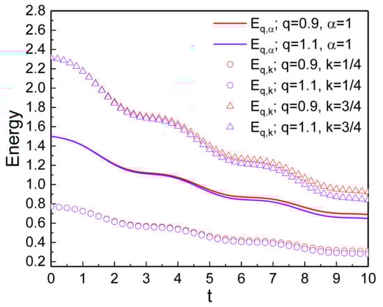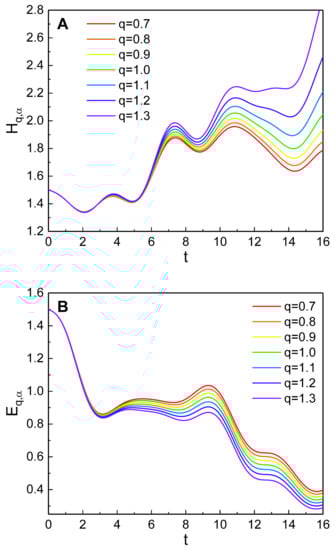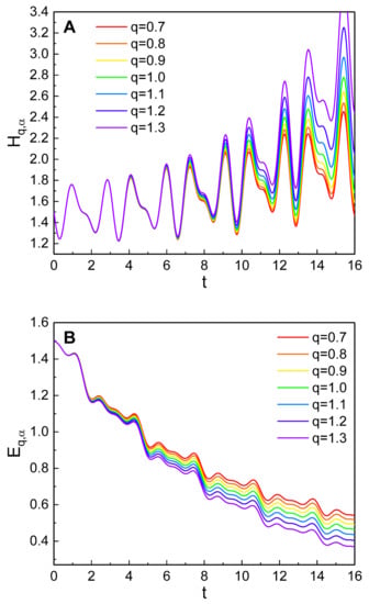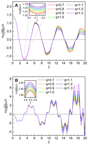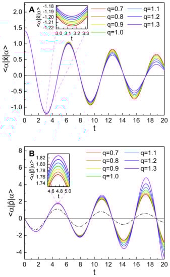 Figure 3 shows a delicate dependence of the time evolution of and on the degree of nonextensivity. The amplitude of decreases as q increases. On the other hand, the amplitude of increases as q becomes large. These consequences reflect the non-exponential behavior for the dissipation over time. Even if is not convergent in time, the expectation value of the physical momentum, , is convergent (see dash–dot curve in Figure 3B).