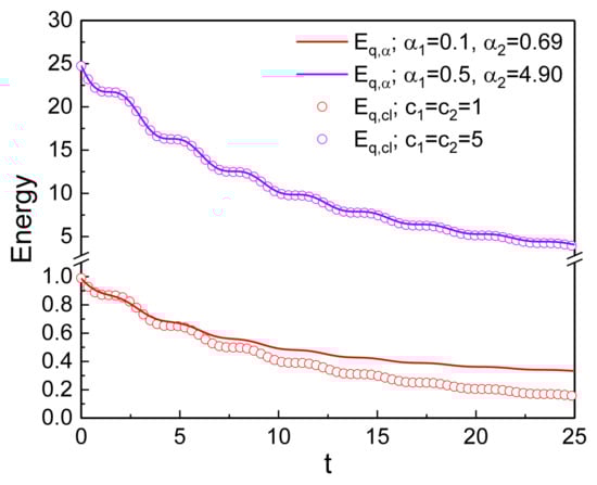 Now, we compare our results for the quantum energy in the Glauber coherent state with those of the classical energy. The classical energy of the system is represented in Appendix C. Figure 8 shows that the dissipation of quantum energy is slower than that of the classical energy provided that the initial energy is sufficiently small (see red curves in Figure 8). The reason the quantum energy does not significantly dissipate in the low-energy regime is the existence of the quantum zero-point energy. However, in the high-energy limit, the zero-point energy can be neglected because it is relatively small compared to the total energy. Hence, we can regard that the quantum energy is almost the same as that of the classical one in that limit (see violet curves in Figure 8), leading to quantum–classical correspondence.