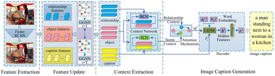 The entire process of the model is summarized as follows: (1) Region proposal and feature extraction. To generate region proposals of objects, relationship phrases and image captions, and extract the features of each region for different semantic tasks. (2) Feature updating. To mutual connect the features of object, relationship, and caption semantic layers based on their spatial relationships, and then jointly iteratively update these features by the GGNN [16]. (3) Context information extraction. A context information extraction network is used to extract relationship context information and scene context information from the updated semantic features, and then take the context information as the input of the attention mechanism. (4) Image caption generation. The output of the attention mechanism and the caption features are merged into the decoding structure to generate description sentences. The core of our work is to use the GGNN for simultaneously passing and updating the features of different semantic layers, and introduce a context extraction network to extract the context information between the different semantic layers to simultaneously improve the accuracy of object detection and relationship detection, and the accuracy and comprehensiveness of the generated image caption.