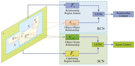 The caption region feature is taken as the initial state of the another LSTM, the relationship information of the object relative to the image scene is used as the input of the LSTM, and the output is the scene context information . Then the relationship context and scene context are used as the input of the attention mechanism.