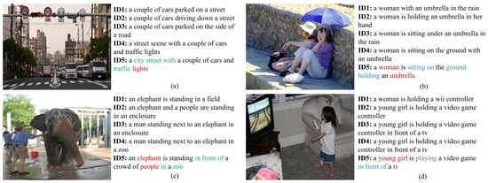 Qualitative examples of generated captions by our proposed MSCI model with different settings. (a–d) display the example results of some COCO images.