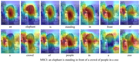 We further visualize the attention regions for words generated by the MSCI model in Figure 6. From the regions of attention by MSCI model, we can find out that the relationship or scene words related to the target objects in the image are generated, the model not only can adaptively attend to the image region related to the generated word at the current moment, but also focus on the related regions that have the context information with the target object. Meanwhile, the attention mechanism can send the features of these image regions and the context information related to the target object into the decoder to guide the generation of description words. For example, when predicting the word “zoo”, our MSCI model not only focuses on the elephant region, but also focuses on the other related regions around the elephant.