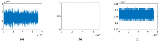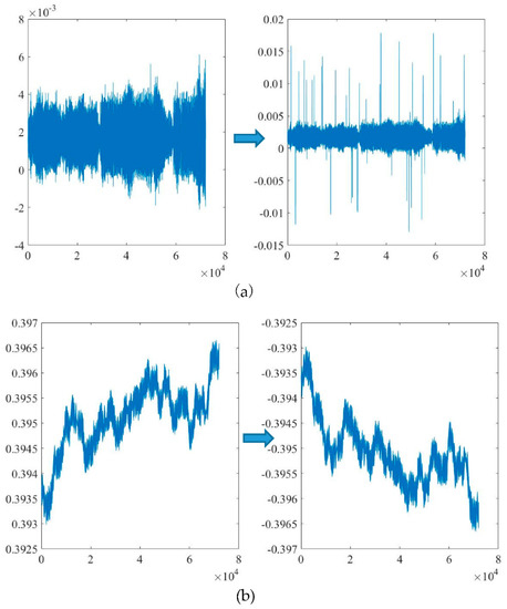 The method of symmetrical flipping and noise addition is used to expand the data of drift samples. The drift data has a random drift upwards or downwards. Therefore, the method of up-and-down symmetrical flipping can construct an effective sample. For the time series {x1, x2, …, xN}, symmetrical flipping can generate a new time series with the same anomaly labels where . Different degrees of Gaussian white noise are added to the original sequence to generate more samples with the same anomaly labels. Two examples of data expansion are shown in Figure 3. The horizontal axis represents the number of sampling points, and the vertical axis represents the acceleration amplitude in m/s2.