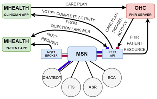 Although highly sophisticated, the (embodied) conversational agents are designed as a prototype (proof-of-concept) and the actual contribution to health-related outcomes is evaluated without relevant statistical significance [52]. Further, the interoperability and integration of data collected in the clinical workflow is not considered. However, meaningful use of collected data will significantly contribute to patient adherence. Sayeed et al. [53] describe an approach to create a patient-centered health system that is based on the FHIR standard and patients/clinicians’ applications that can make requests and reports of HL7 FHIR resources. Following the same baseline workflow, i.e., the collection of PGHD and forming of FHIR resources, the proposed systems aggregates combine FHIR resources with MSN to offer a fully connected and integrated approach of collecting and integrating PGHD in clinical workflow.