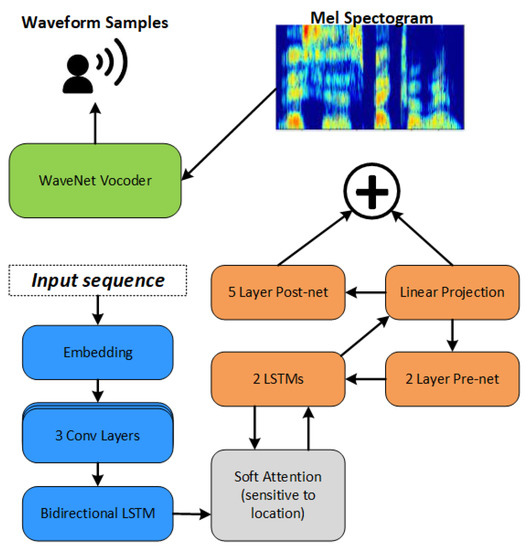 - Shen, J.; Pang, R.; Weiss, R.J.; Schuster, M.; Jaitly, N.; Yang, Z.; Wu, Y. Natural tts synthesis by condi-tioning wavenet on mel spectrogram predictions. In Proceedings of the 2018 IEEE International Conference on Acoustics, Speech and Signal Processing (ICASSP), Calgary, AB, Canada, 15–20 April 2018; pp. 4779–4783. [Google Scholar]