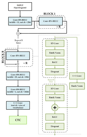 - Li, J.; Lavrukhin, V.; Ginsburg, B.; Leary, R.; Kuchaiev, O.; Cohen, J.M.; Nguyen, H.; Gadde, R.T. Jasper: An End-to-End Convolutional Neural Acoustic Model. arXiv 2019, arXiv:1904.03288. [Google Scholar]