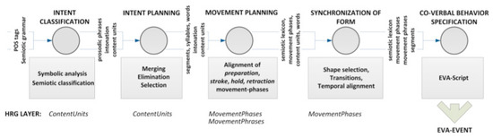It is based on the idea of segmenting a text sequence into non-verbal conversational intents and represent them as content units (CUs). As outlined in Figure 6 the algorithm performs the five phases in order to generate and synchronize no-verbal behavior with speech signal. In phase 1, the intent classification, it tries to recognize morphosyntactic patterns in the text and assign them and a communicative intent. The input of phase 1 is the POS-tagged text and the Semiotic Grammar; where the semiotic grammar represents a finite parametric space of the intent . The output of phase 1 is a set of multiple content units representing all possible communicative intents recognized in the text sequence. The content units identified may overlap and introduce inconsistencies. Thus, in phase 2, the intent planning, the algorithm needs to resolve these inconsistencies by elimination, margining and selection process. The algorithm considers prosodic alignment (i.e., prosodic phrases and intonation) to define final sequence of communicative intents to be ‘visulalized’. In phase 3, the movement planning, for each planned intent an appropriate movement structure, i.e., the prosody of movement represented through movement phases (preparation, stroke, retraction, and hold), must be defined. Namely, a gesture phrase , visualizing the input text, is then defined as a sequence of gestures Gi visualizing each such content unit: