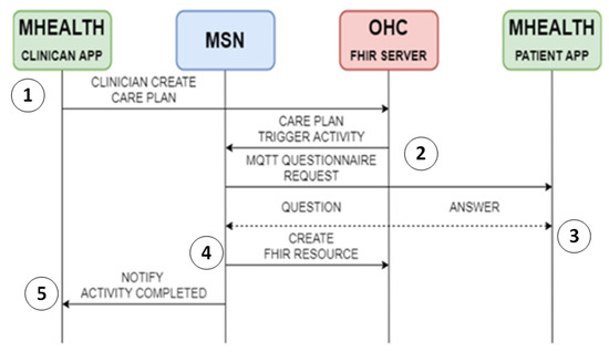 As highlighted in Figure 7, the integration of a PRO starts in phase 1, when a clinician specifies a ‘Care plan’ FHIR resource (FHIR CarePLan: https://www.hl7.org/fhir/careplan.html, last visited 19 June 2021) for the patient. The care plans can be used for a general practitioner to schedule and keep track of when their patient is due to carry out a specific activity. In case of PERSIST, a self-report. Exploiting this resource, the OHC FHIR server is capable to automatically trigger a request for the ‘todo’. This request is triggered by sending a ‘notification’ to the patient via the MQTT Broker hosted on the MSN (i.e., phase 2 in Figure 7). The notification about the triggered activity is sent through MSN’s MQTT broker to the patient mHealth App in JSON data format. The patient can see five types of notifications: a request to fill the questionnaire, a request to provide information about the mood, a request to record a diary, a notification of a received message from the clinician, and other notifications. For all notification types, after the activity or ‘todo’ has been fulfilled the MSN automatically transforms the response into FHIR resource (phase 4 in Figure 7). Three types of resources are used, ‘Observation’ (FHIR Obsevation: https://www.hl7.org/fhir/observation.html, last visited 19 June 2021) to store reports regarding well-being (i.e., mood reports) and biometric data, ‘DocumentReference’ (FHIR DocumentReference: https://www.hl7.org/fhir/documentreference.html, last visited 19 June 2021) to store diary recordings and ‘QuestionaryResponse’ (FHIR QuestionarryResponse: https://www.hl7.org/fhir/questionnaireresponse.html, last visited 19 June 2021) The system also notifies the clinician that an activity was completed (phase 5 in Figure 7).