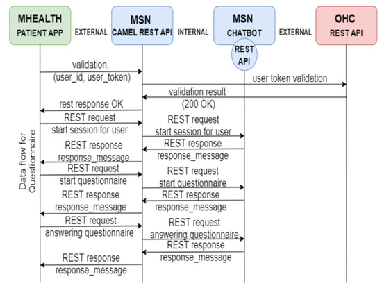Figure 8 highlights the dataflow for the case of a request to answer pro (i.e., phase 3 in Figure 7). As highlighted in Figure 8, the main actor of the execution of the activity is the patient who uses the Health App to carry out the activity. The MSN and ECA (Chatbot) personalize interaction by delivering symmetric interaction on both input and output. The OHC implements JSON Web Tokens (RFC 7519) to ensure claims between two parties (i.e., mHealthApp and MSN) are secure. The process is initiated when a patient clicks on the notification request and thereby starts the question and answering (Q&A) dialog. In this exchange the ECA delivers questionnaires as multimodal responses and the user delivers the answer by clicking on the option or by answering with speech.