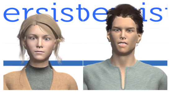 Instead of delivering merely a chatbot, in the proposed system, an ECA is presented. ECAs can further increase the long-term adherence by engaging with users in more diverse interaction significantly enriched by incorporating non-verbal communication [37]. One of the earliest definitions of ECA is “more or less autonomous and intelligent software entities with an embodiment used to communicate with the user” [39]. ECAs can deliver a system with symmetric multimodality with speech, gesture, facial expression on both the input and the output side. The main three components of ECAs are user interfaces for communication with the ECA; computer modelling structure to make the ECA react emphatically; and embodiment (visual representation) for communication with users. Embodiments can be designed as virtual human characters [40], animals [41], or robots [42]. In general, the fully symmetric interaction opens up the opportunity to introduce human-like qualities, significantly improving the believability of the interfaces [43]. The main areas of ECAs in healthcare are the treatment of mood disorders, anxiety, psychotic disorders, autism, and substance use disorders [44]. In a review of Kramer [17] about the design and evaluation of the ECAs for healthcare, ECAs proved a promising tool for persuasive communication in healthcare. And, in another review study [42], technological and clinical possibilities of less complex ECAs were investigated and shown as a solution for routine applications in the means of rapid development, testing, and application. The design features of ECAs for healthcare were investigated by Stal [45] who found that the agents’ speech and/or textual output, as well as its facial and gaze expressions are the most used features for ECAs. Previous ECA studies for healthcare mainly focused on physical activity [46,47,48], nutrition [49,50], stress [34], blood glucose monitoring [41], and sun protection [51]. Overall, most of related research on ECAs, however, focuses on speech, facial, and gaze expressions as the main design features [45]. Most of the ECAs in healthcare are 2D based. Their gestures (as part of the non-verbal communication channel) and appearance are most often not considered as main design features. In fact, Kramer [17] reviewed 20 ECA studies to compare their functionalities and appearances. For the appearance of ECA, most of the studies used similar virtual human characters like middle-aged African American women. Moreover, only 3 studies actually addressed gestures. As a contrast we offer two fully ECAs,, a male and a female, capable to interact with patients in six languages: English, French, Latvian, Slovenian, Spanish, and Russian. Both can not only represent facial expressions but exploit gestures to enhance user experience by regulating communicative relationships, support verbal counterparts, and maintain certain degree of clarity in the discourse.
