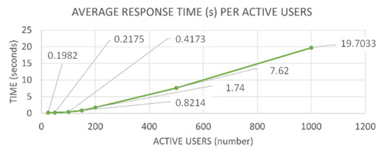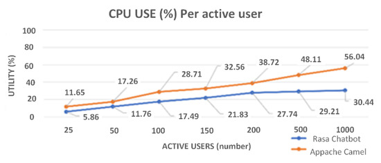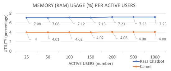 As can be seen from data in Figure 10, with the duplication of active users in tests, CPU usage is rising linearly from 11.65% on 25 active users, to 56.04% on 1000 active users for Camel, and also mostly linear from 5.86% on 25 active users, to 30.44% on 1000 active users for Rasa chatbot. In Figure 11, volatile memory was stagnating on both the Camel and the Rasa chatbot and proved independent of the increase of users. On Camel, memory usage was near 50%, and on the Rasa chatbot near 25%. Figure 12 shows MSN’s internal average response time on requests between 25 and 1000 active users. At 25 active users, response time is 0.1982 s, and it is increasing linear as the number of users is increasing, up to the point of 200 active users where we see 1.74 s response time. From there it starts going up more exponentially to 197,033 s of delay when 1000 active users appear.