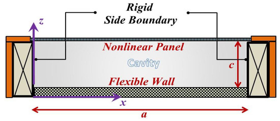 where A and B are the vibration responses of the nonlinear symmetric panel and flexible wall subject to the normalized acoustic pressures Pc and Po, respectively. Pc and Po depend on A and B. Thus, Equations (1) and (2) are coupled (the derivations of Pc and Po are shown in the next section);