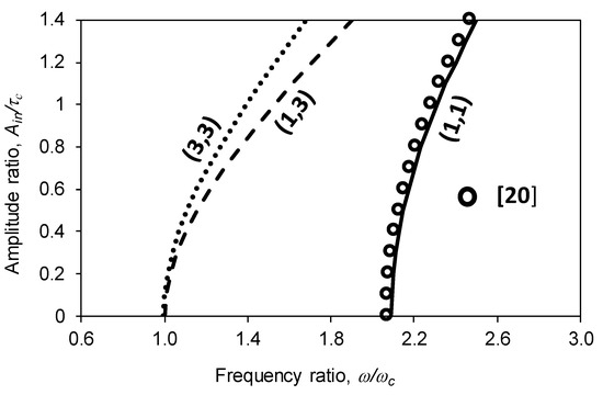 Figure 2 shows the amplitude ratio of the nonlinear symmetric panel plotted against the frequency ratio for various panel resonances. Note that the wall is rigid. Obviously, the first three frequency ratios are monotonically increasing with the amplitude ratio. The first resonant frequency ratio (the solid line) is compared with a set of circles obtained from [20]. The first resonant frequency ratios obtained from the proposed method and the finite element method agree reasonably well with each other. When the amplitude ratio = 0, the higher mode resonant frequency ratios (i.e., (1,3) and (3,3) modes) are close to one, and the first resonant frequency ratio is much higher. It is implied that the higher mode resonant frequencies are not significantly affected by the air cavity stiffness. The slope of the solid line is deeper than those of the dashed and dotted lines, which represent the (1,3) and (3,3) mode frequency ratios. This implies that the higher mode resonant frequency ratios are more sensitive to the vibration amplitude. Figure 3 shows the amplitude ratio plotted against the first resonant frequency ratio for various thickness ratios (i.e., the ratio of wall thickness to nonlinear panel thickness, τo/τc). Note that the nonlinear symmetric panel thickness is kept unchanged. When the wall is thicker, the overall cavity stiffness is stronger. This explains why the line of τo/τc = 8 is the farthest to the right. This implies that the resonant frequency and the stiffness in this case are the highest among them. Interestingly, all these lines look quite parallel to each other. For Ain/τc = 0, the frequency ratio difference between the cases of τo/τc = 2.5 and 8 is about 7.2%; for Ain/τc = 1.4, the frequency ratio difference between the cases of τo/τc = 2.5; 8 is also about 7.2%.