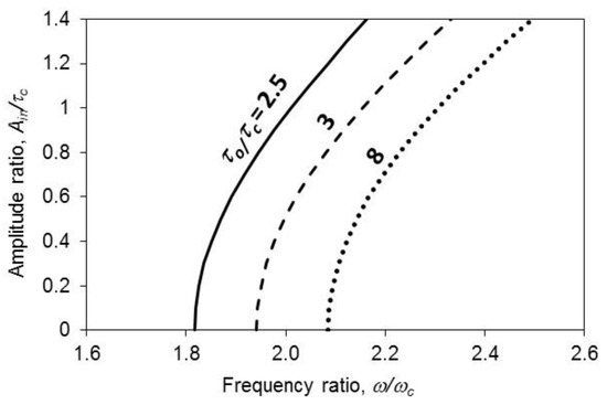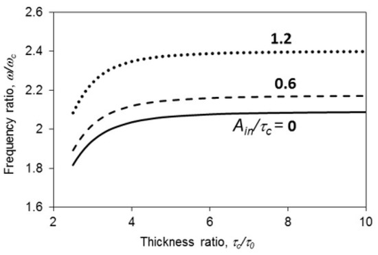 Figure 4 shows the nonlinear panel amplitude ratio plotted against the flexible wall amplitude ratio for various thickness ratios. All of the ratios monotonically increase. The line of τo/τc = 8 is almost vertical. This implies that the wall vibration amplitude is inert to the nonlinear vibration amplitude. Comparatively, the wall stiffness is much stronger than the nonlinear panel stiffness, and it can be considered as nearly rigid. Hence, the ratio of wall amplitude to nonlinear panel amplitude is very small. An example of this is the line of τo/τc = 3, when Ain/τc = 1, Bo/τo = 0.0691. All lines in Figure 4 are nearly linear, particularly for the cases with a high τo/τc ratio. In the cases of τo/τc = 3 and 2.5, the lines are slightly curved when Ain/τc > 1. Figure 5 shows the first resonant frequency ratio plotted against the thickness ratio for various amplitude ratios. The frequency ratio in the case of the highest Ain/τc is always higher than those of the other two cases because the highest ratio of Ain/τc represents the highest stiffness. When τo/τc > 5, the three lines are almost horizontal. This implies that the wall is stiff when the ratio of τo/τc = 5. There is not much change even after the ratio of τo/τc further increases. Figure 6 shows the first resonant frequency ratio plotted against the thickness ratio for various cavity depths. The frequency ratio in the case of the shortest cavity depth is always higher than those in the other two cases. This is because the cavity with the shortest depth is the stiffest. Similar to those in Figure 5, the three lines in Figure 6 are almost horizontal when τo/τc > 5. Unlike those in Figure 5, the lines of cavity depths = 0.1524 m and 0.1016 m are insensitive to the ratio of τo/τ for almost the entire range. Only the line of cavity depth = 0.0508 m is sensitive to the ratio of τo/τ when it is less than 3. Figure 7 shows the center pressure ratio plotted against the cavity depth ratio for various amplitude ratios. The three lines are monotonically decreasing. When the cavity depth is short (e.g., c = 0.1 m), the three center pressure ratios are almost the same. When the cavity depth increases in length, the three lines deviate from each other. In the linear case and the most nonlinear case (i.e., the amplitude ratios = 0 and 1.2), the pressure ratios are always the highest and lowest for the entire range, respectively. The higher pressure ratio implies that the pressure at z = c transmitted to z = 0 is smaller (lower transmission loss).