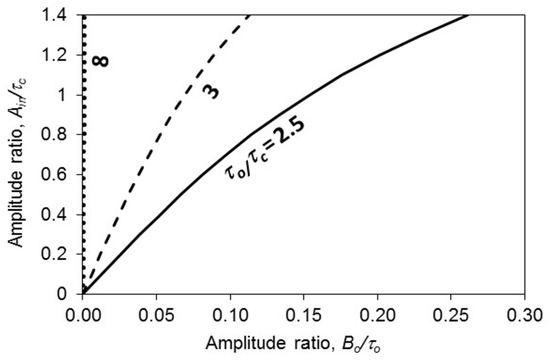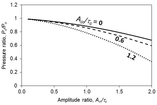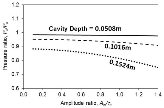 Figure 8 shows the center pressure ratio plotted against the amplitude ratio for various cavity depth ratios. Unlike those in Figure 7, only the line with the longest cavity depth in Figure 8 is monotonically decreasing. The other two lines are almost horizontal, or the two center pressure ratios are inert to the amplitude ratio. This implies that the ratio of the pressure at z = c transmitted to z = 0 is almost constant. In the case of the longest cavity depth, the cavity stiffness is the weakest so that overall cavity stiffness is sensitive to nonlinear stiffness, and it can significantly affect the pressure transmission ratio.