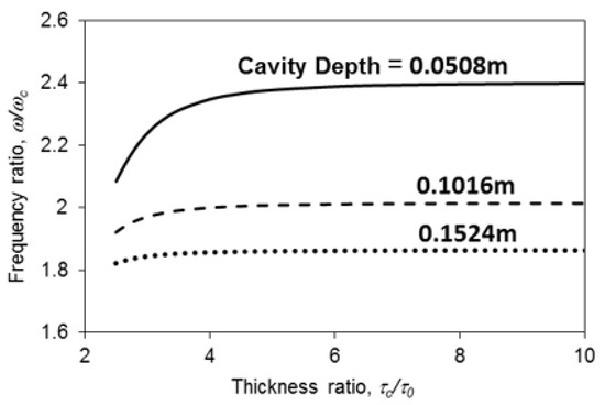 First resonant frequency ratio vs. thickness ratio for various cavity depths.