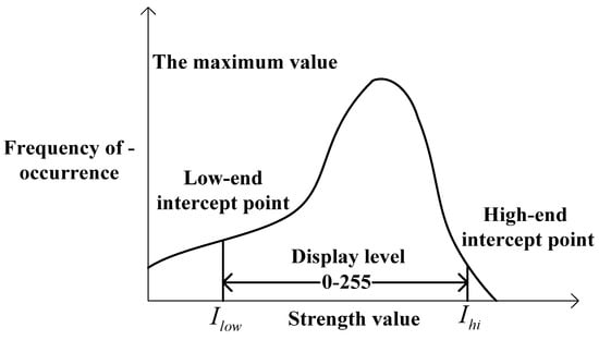 Among them, represents the number of pixels with a gray scale of , and represents the total image prime number. represents the value of the image histogram, as shown in Figure 2, where the low-end intercept point and the high-end intercept point are the and mentioned above.
