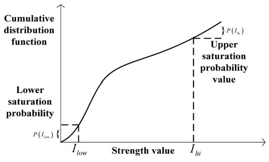 Formula (14) is called a cumulative distribution function (CDF), which represents the proportion of pixels of an image under certain intensity. In the contrast enhancement of images, a certain proportion of pixels will reach saturation or lower saturation, which is expressed by and , and these two points can be found by analyzing the relationship between the CDF and the histogram. Specifically, using and to represent the probability of upper saturation and lower saturation, the corresponding image intensities are and , as shown in Figure 3.