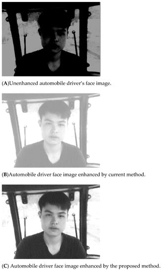 Then, the MSRCR image enhancement method mentioned in this paper is verified. The existing unenhanced automobile driver’s face image is enhanced with the current method and the method of this paper. The results of the experiment are shown in Figure 6.