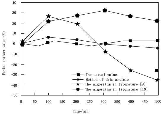 Finally, the automobile driver is tested under the single sample condition, and the size of the comfort value of the face mentioned in Formula (17) is calculated by different methods. The results are compared with the actual value according to the calculated results. The comparison results are shown in Figure 7.