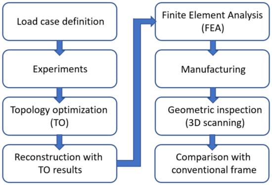 With inspiration taken from the above studies, this manuscript suggests a workflow of the TO process considering a scooter frame from the design to the manufacturing stage. Specifically, a conventional scooter frame was examined, TO was utilized subsequently for the redesigning purpose, and SLM AM technology was deployed to fabricate the frame with stainless steel 316L. The frame eventually underwent geometric and strength inspections for comparison with its CAD and conventional counterparts. The TO scooter frame was produced following the workflow presented in Figure 1.