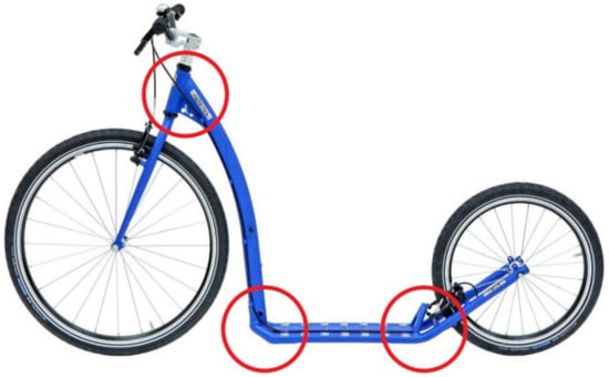 The scooter dimensions had a maximum of 1720 mm length and 960 mm height. The circled areas, from left to right, are the transition between the head tube and the down tube, the transition between the down tube and the step board, and the transition between the step board and the rear fork, which are hereafter orderly referred to as fork neck, front transition, and rear transition. Having considered these assumptions and experimental results, the design area of the scooter frame for TO was modeled as described in the next section.