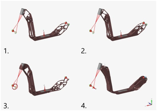 As mentioned in Section 1, for TO studies, it is necessary to define the typical load cases for the conventional scooter under operation. In this study, there are four load scenarios considered and, accordingly, the experimental results on the conventional frame are presented.