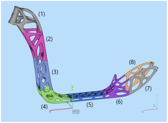 There was a need to divide the frame into eight different sections in order to fit it in the limited space of the building chamber of the Renishaw AM400 printer. This size is by default L250 × W250 × H300, which must be then subtracted from the no-build zone due to four corner screws for mounting the building platform to the printer, leaving the available space for printing of L248 × W248 × H285. Furthermore, the default thickness of the building platform is 15 mm for H300, leaving only H285, and adjustments must be made accordingly for different platform thicknesses. The sectioned frame can be seen in Figure 6.