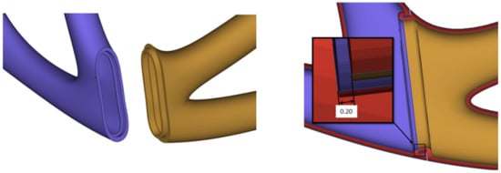 The PolyNURBS results were solid, which would result in an overweighted scooter frame. Thus, the frame was hollowed with an outer thickness of 1.2 mm utilizing the software Materialise Magics. In Figure 7, two hollowed sections of the frame are presented. Furthermore, the transitions between them were designed with a special fitting for frame assembly by welding.