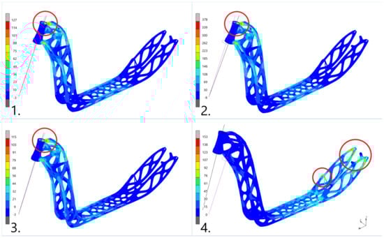 FEA results in four load cases: (1) normal operation, (2) drop, (3) braking, and (4) torsional stiffness.