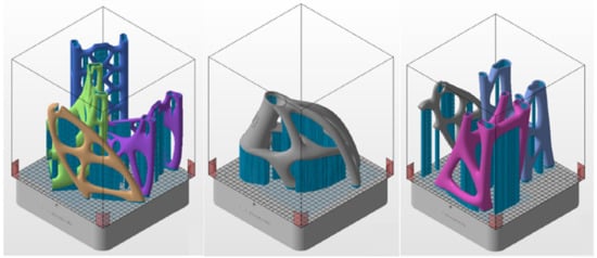 The STL files of the frame sections were imported into Autodesk Netfabb for component distribution on the building platform, support creation, and slicing operation to prepare for printing. Having considered the aforementioned size constraints of the building chamber, the distribution of the frame sections along with their supports could be realized, as presented in Figure 9.