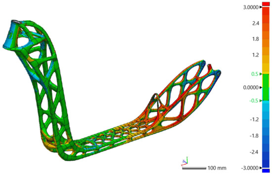 The TO frame was 3D scanned for geometry inspection using Creaform Handyscan Black, with software VXElements and Geomagic Control X. Geometry inspection on the subsections was not performed because it was more appropriate to consider the assembled frame, whose overall geometry would affect the functionality of the scooter. Accordingly, the geometric accuracy of the 3D scanned assembled frame in comparison with its CAD counterpart by means of surface deviation is illustrated in Figure 10.