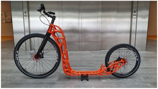 As can be observed in Figure 5, the conversion took into account the symmetric nature of the scooter frame. With respect to the TO results, attention was paid to the fork neck, the front and rear transitions, and the rear fork, as more material was distributed there. One of the key features for maximal stiffness was the braided design of the fork neck. Moreover, the logo of the laboratory was added. Instead of the solely carved-in feature suggested in the TO results, the step board was reinforced with vertical trusses for stiffening. At the rear transition, a V-shaped feature was additionally designed mimicking the conventional frame for safety purposes, preventing the driver’s legs from colliding with the back wheel. Subsequently, the model could be processed further for the manufacturing stage.