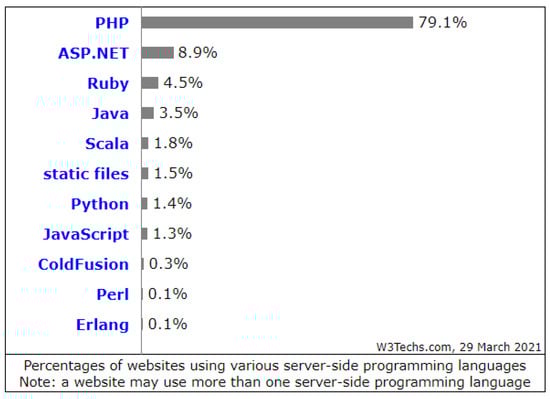 The WebShell detection method proposed by people from the perspective of statistical features and grammatical features has been able to identify Java WebShells well, but the improvement of WebShell detection capabilities is also faced with the hidden monster, that is, the PHP WebShell detection problem. Figure 1 shows the percentage of websites with various server-side programming languages calculated by W3Techs. Among them, 79.1% of the websites use PHP for server-side development, ranking first, far surpassing ASP.NET and Ruby, which are ranked second and third. Since most web pages are written in PHP and support many dynamic features, there are more and more ways to obfuscate the WebShell in the PHP category. Therefore, this article mainly studies WebShell files written in PHP. For the convenience of presentation, it is referred to as WebShell in the text.