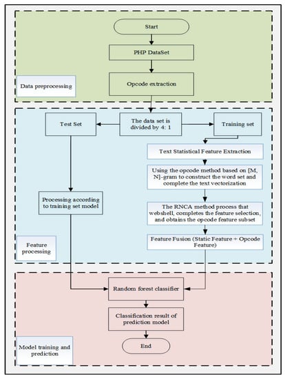 WebShell detection based on opcode features is a hot research object in recent years. Yong F [] discussed the effectiveness of opcode sequences for WebShell detection, and proposed a combined algorithm FRF-WD based on FastText and random forest. Opcode sequences are used as an important feature of the prediction model. Experimental results show that the model provides a low false alarm rate, and the accuracy rate is as high as 99.23%. Hong Cui et al. [] proposed a PHP-like WebShell detection method based on RF-GBDT (random forest gradient advancing decision tree) model. It is a combination of the random forest classifier and the GBDT classifier. It uses common statistical features of PHP files and text features of opcode sequences. The accuracy of the trained model is 99.169%, and the false alarm rate is 0.682.