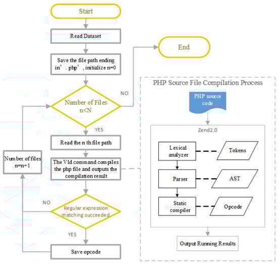 - Extract opcodeOpcode is an abbreviation for opcode. An instruction can contain one or more opcodes. After lexical analysis, syntax analysis, and static compilation, each PHP script finally obtains an opcode sequence. In this paper, plug-in VLD is used to convert source code and opcode. Figure 3 shows the whole process of opcode extraction. First read the data set, save the storage path of the PHP file, VLD commands such as: -d vld. active=1-d vld. execute=0 a. PHP outputs the compilation layer results of the corresponding file. As shown in Figure 4, the compilation result of a Trojan horse is the line number, instruction code, script start tag, end tag, opcode operation code, additional data associated with the opcode (such as the jump target opcode), return value, and instruction parameters. Regular expressions are used to align the column where the opcode is located, and each opcode is saved in sequence. Positive samples and negative samples respectively extract opcode sequences according to the process of Figure 3, and save the results under two files for subsequent data processing. Figure 5 shows the opcode sequence extracted from a PHP file.