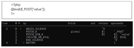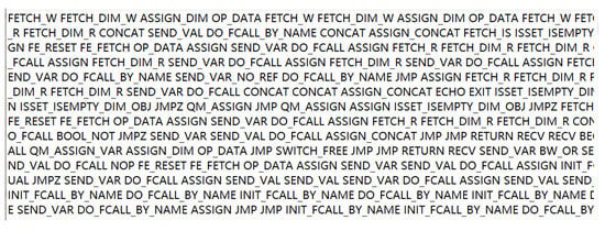 Figure 5. Opcode representation of a PHP file. - Opcode vectorizationOpcode text is ordered, and the context of an opcode is associated. The traditional N-gram algorithm divides all opcode sequences into fixed-length corpus fragments to form opcode word bags. However, this segmentation method ignores the influence of different opcode sequences on WebShell detection results, so expressing opcode sequences as different lengths for feature selection has a positive impact on detection. In this paper, in order to find out the opcode feature sequence that can effectively identify WebShell, this paper proposes an opcode feature processing method based on [M, N]-gram, which preserves the context environment of samples as much as possible. The algorithm flow is shown in Algorithm 1.