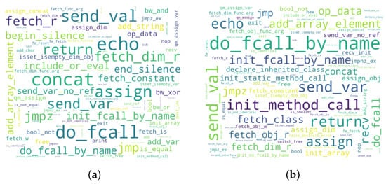The compiled bytecode data have obvious characteristics, and the data compiled by WebShell and the data of normal samples show obvious differences in many dimensions. We use word cloud tools to show the overall visibility of the data and analyze it. As shown in Figure 7, it can be seen that the distribution of hot words in the two samples is very different. The positive sample set is distributed in words such as “do_fcall_by_name”, “send_var”, and “init_method_call”, while the WebShell sample set is distributed in “do_fcall”, “echo”, and “concat”. The different distribution proves that the two have different emphases on function.