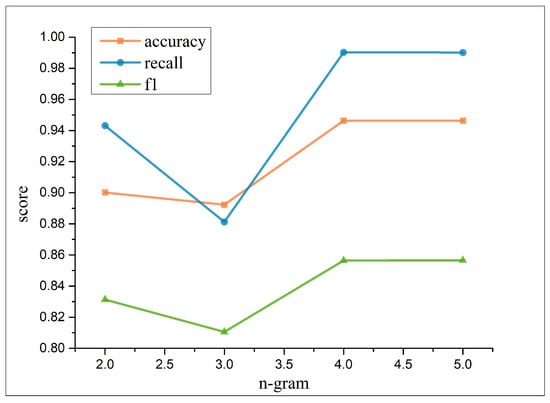 According to the weight of each feature calculated by RNCA, As shown in Figure 11, we select the features whose weight value is greater than 5% of the maximum weight value as the final classification features, and finally select 31 valid detection features, of which the values of the first five features are shown in Table 4. Among them, send_val do_fcall, do_fcall, end_silence, and send_val do_fcall_by_name init_fcall_by_name sequences are often used to call new functions to realize certain functions of scripts, concat concat and assign concat are often used for string splicing. These behaviors conform to the characteristics of conventional WebShell construction. For the test results using the model, three indicators are used as standards, namely accuracy, recall rate, and F1-score.